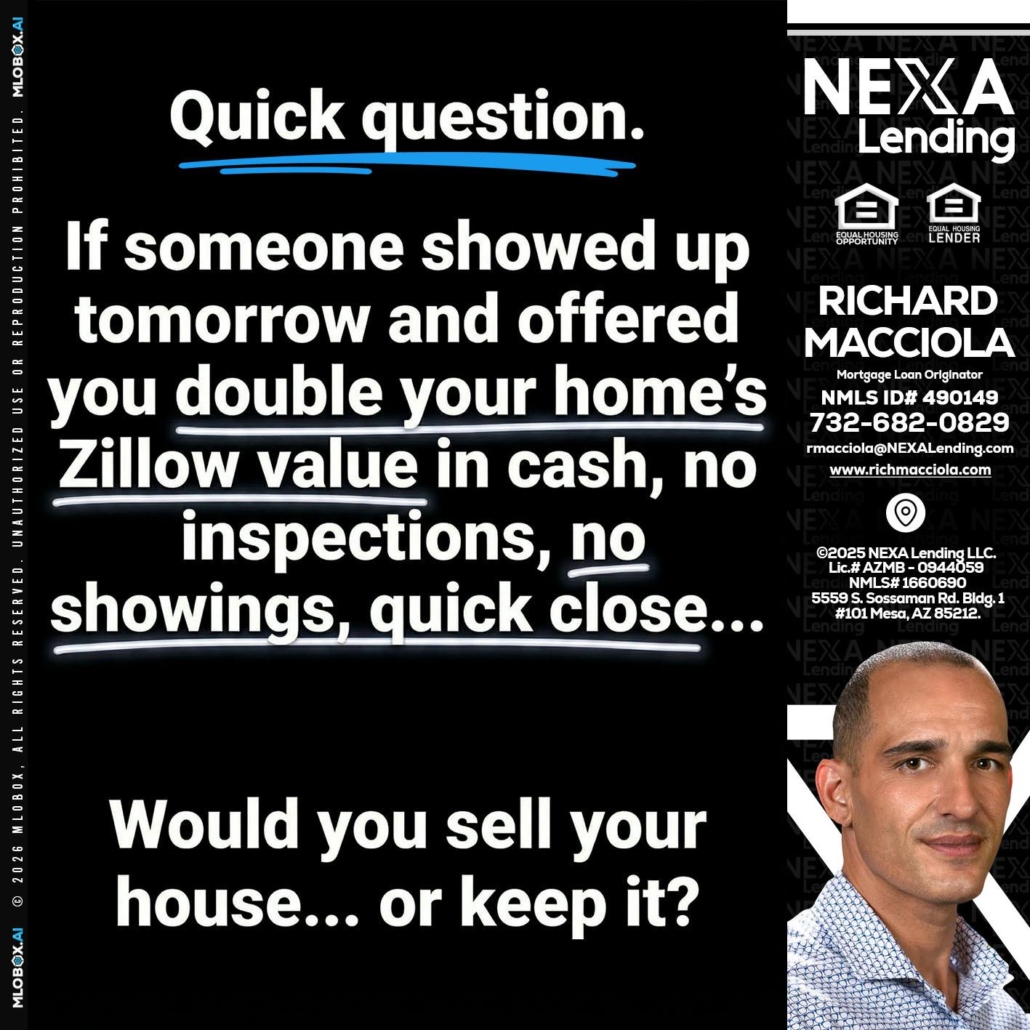 QUICK QUESTION - Richard Macciola -Mortgage Loan OriginatorHi, my name is Richard Macciola. I’m a Loan Officer with NEXA Lending LLC., offering personalized mortgage solutions, fast customized quotes, great rates and service with integrity.